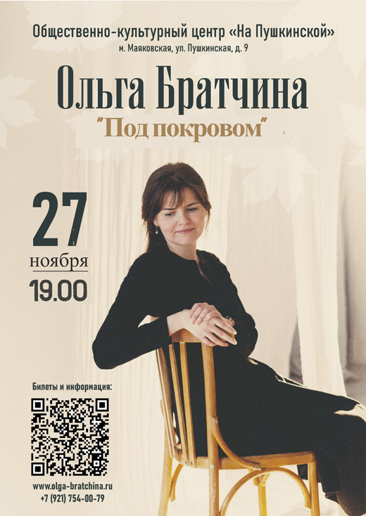 Билеты и подробности: https://afisha.nethouse.ru/event/olga-bratchina-pod-pokrovom-1